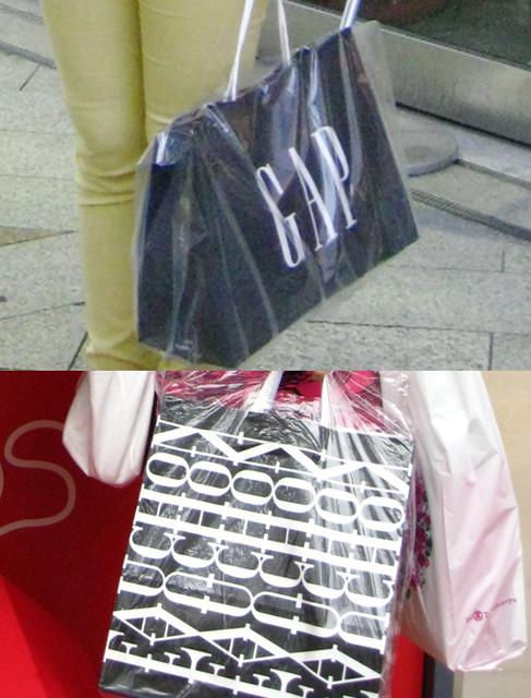它們會將你購買的商品外頭再用一層塑膠袋包起來,以防購物紙袋被雨淋濕。