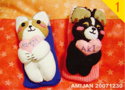 ninja(忍者)和手機套合照,手機套上還有縫製他們的名字喔!