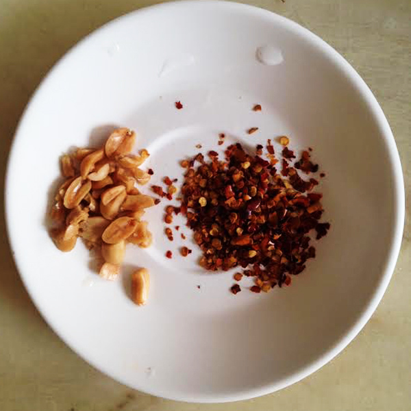 最後上盤後放嫩的韭菜、花生碎粒、辣椒片、檸檬丁
