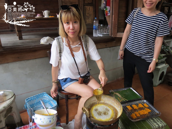 今天我們搭了號稱泰國水上計程車-長尾船到了河邊一處住所,在樓下參觀了類似泰國人小時候的雜貨店後就上樓體驗做泰國皇室甜點,然而這個甜點有很多名稱,英文叫『Foi Thong』,中文有人叫它『蜜香蛋黃絲』、『蛋絲甜點』,而『Foi Thong』其中的『Thong』在泰文意思是黃金的意思,所以這道甜點細絲又金黃的樣子也能稱為金絲,更有人稱它為『天使的頭髮』,這樣研究下來,覺得一到聽到它的名字就會立刻覺得很尊貴又特別。這時本來看著別人在做,但覺得實在太特別了,於是就跳下去親自體驗看看,而且這不是一次兩次就能做得成功啊,我覺得我做得好醜喔,如果在古時候的話,我做的甜點一定送不出去啊!