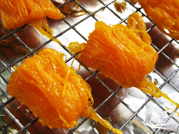 將黃黃的是鴨蛋、雞蛋的蛋黃打在一起,然後用個類似漏斗的工具,往沸騰的糖水上淋,接著再用竹籤將一絲絲的蛋黃絲撈起來,淋蛋黃要功力,撈蛋黃絲也要功力啊,如何讓它一排排有規則的聚成一坨,然後再放到旁邊冷的糖水裡冷卻定型,接著放在旁邊的網子上晾乾就可以了!